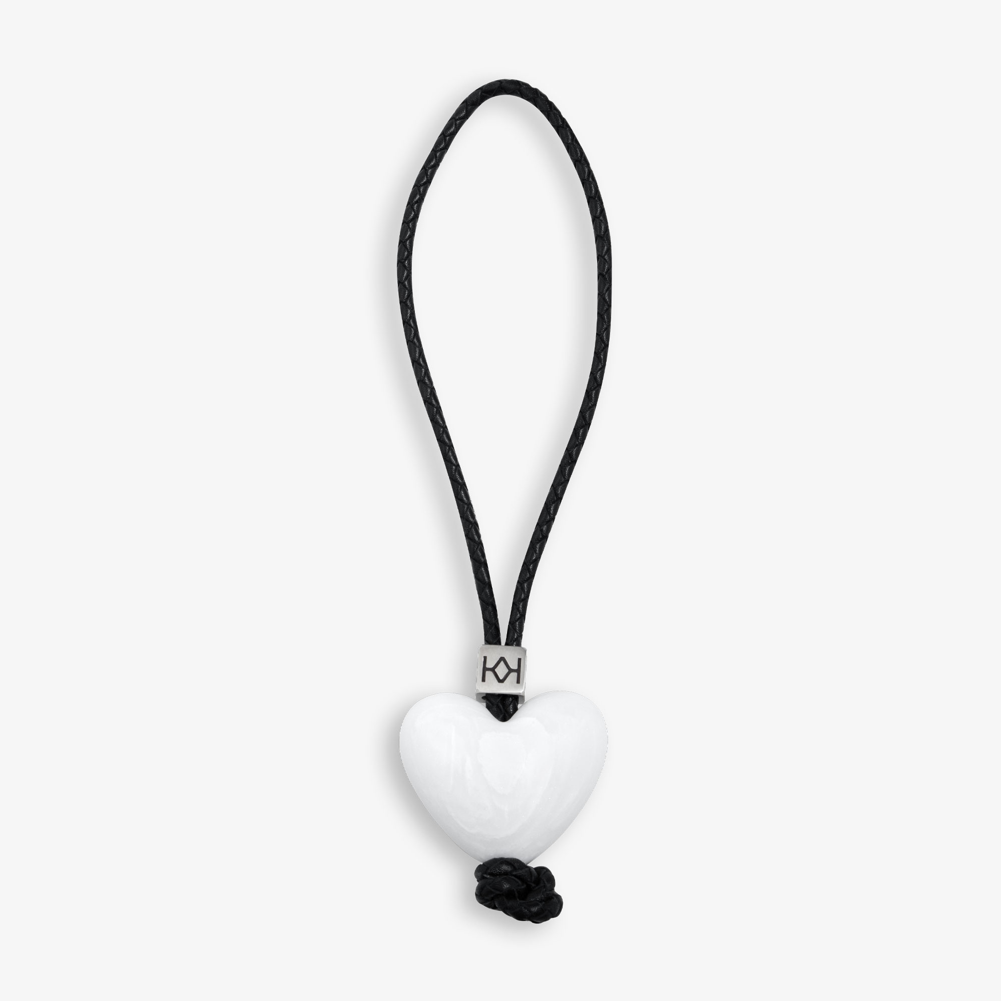 Біле серце. Мінеральний акриловий камінь, плетений шкіряний ремінець і сріблястий куб із логотипом КК. Форма, створена з точністю та вручну відполірована до ідеальної гладкості. Невелика деталь, що додає сумці індивідуальності.