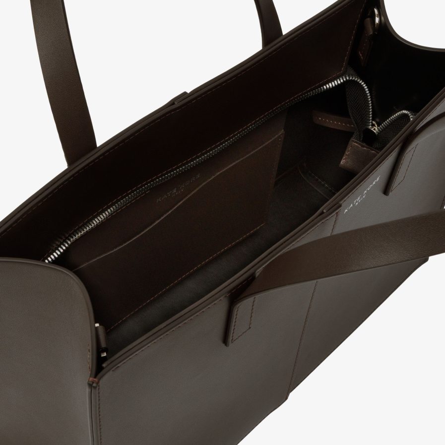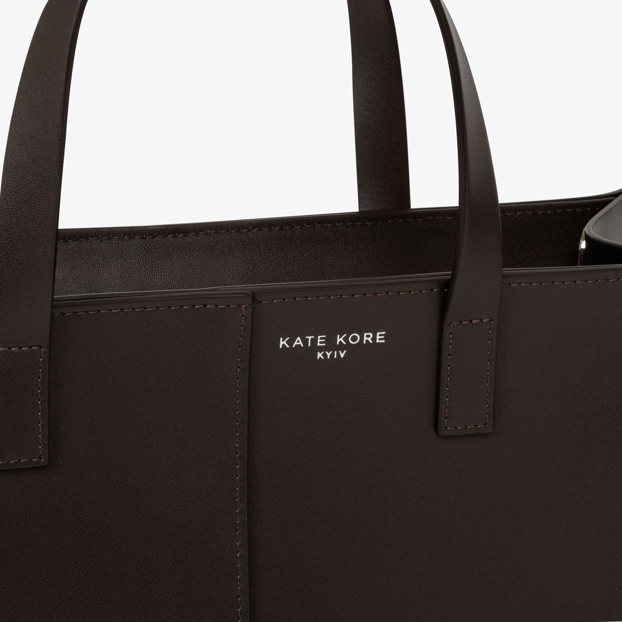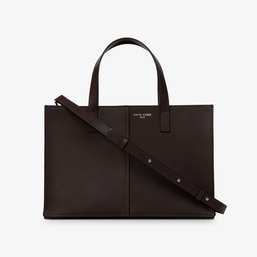 Сумка Tote створена з матової гладкої шкіри, що надає їй вишуканого вигляду та приємної текстури. Містке основне відділення на надійній застібці доповнене внутрішньою кишенею для мобільного телефону чи важливих дрібниць. Ця сумочка з легкістю вмістить невеликий ноутбук, щоденник, косметичку та інші необхідні речі, залишаючись стильною та практичною супутницею на кожен день. Tote — це ідеальний баланс між функціональністю та елегантністю.